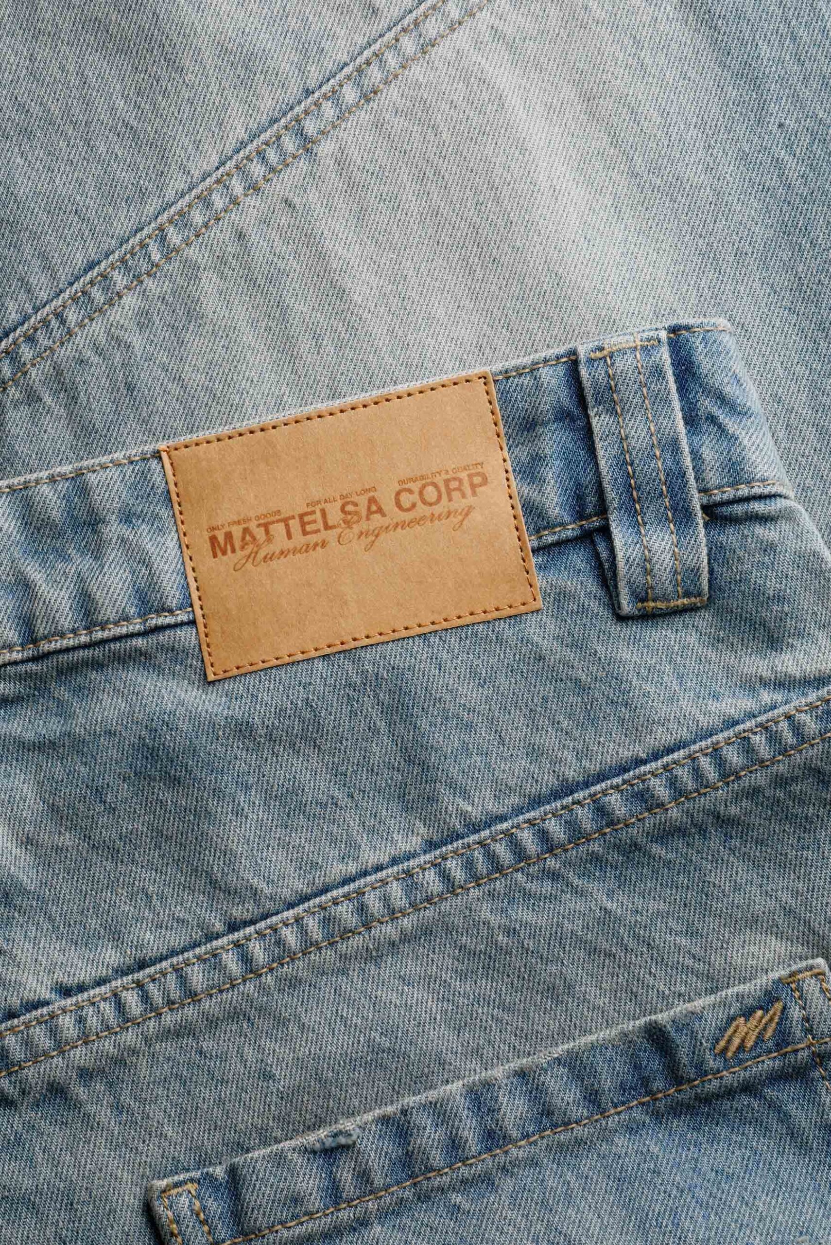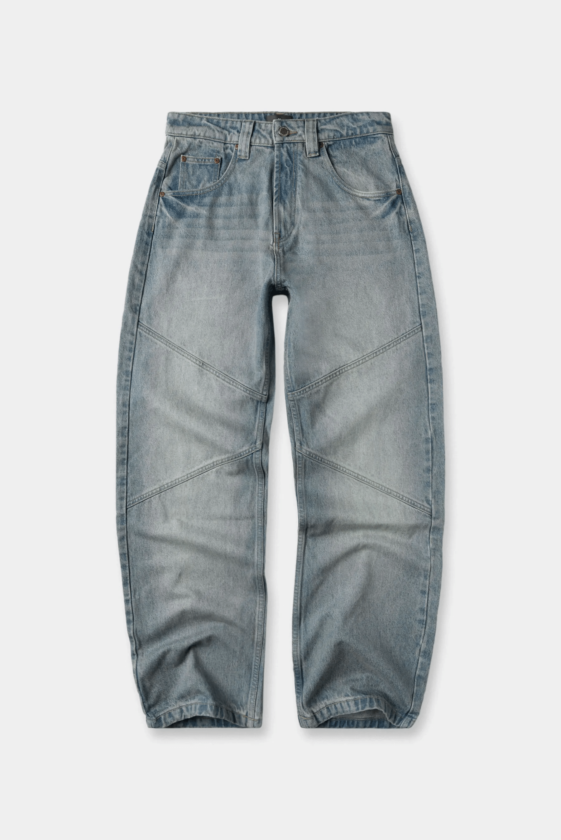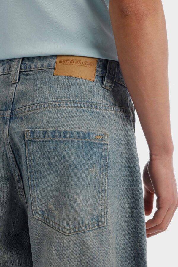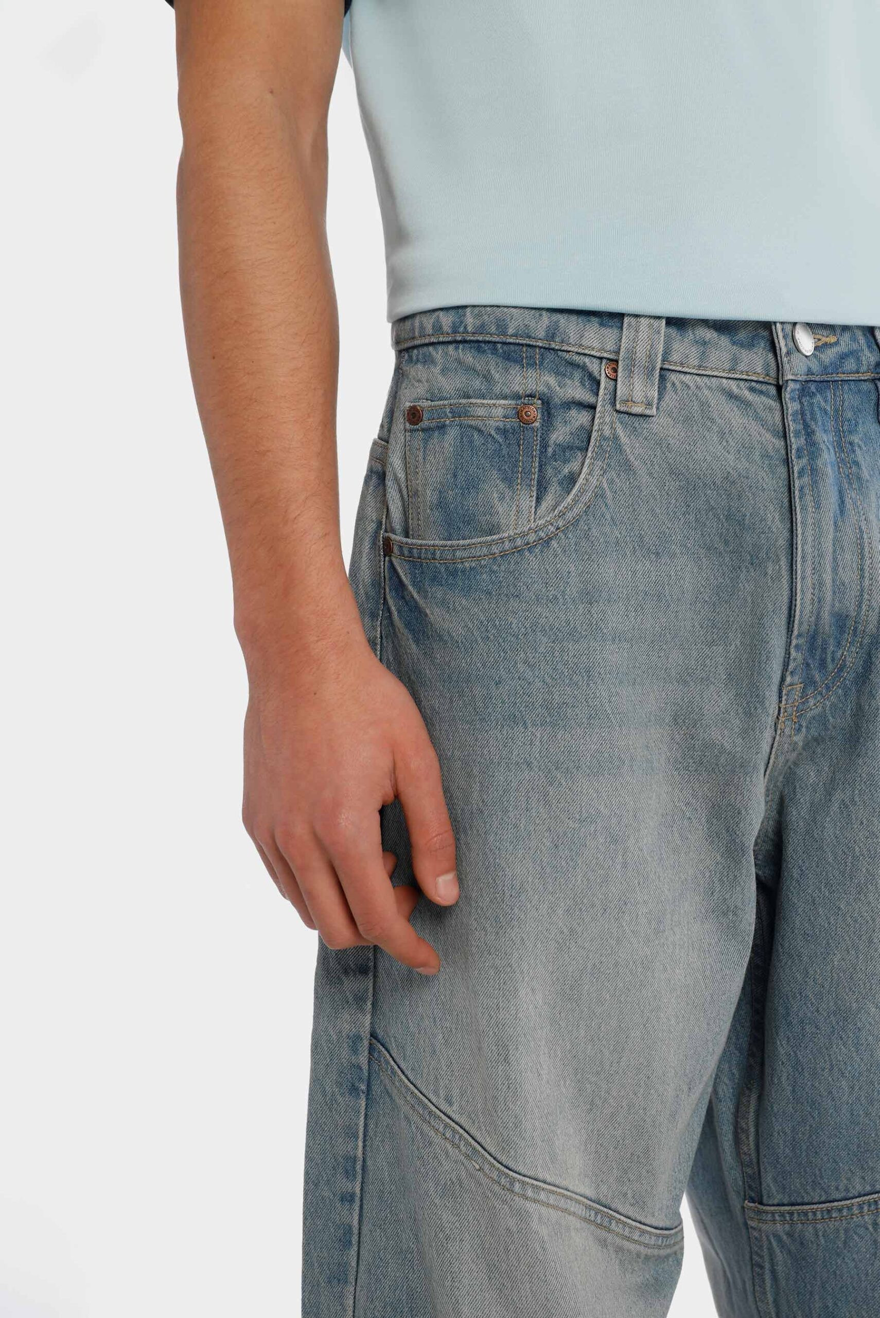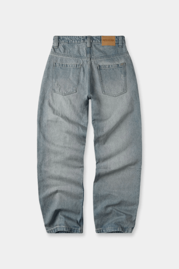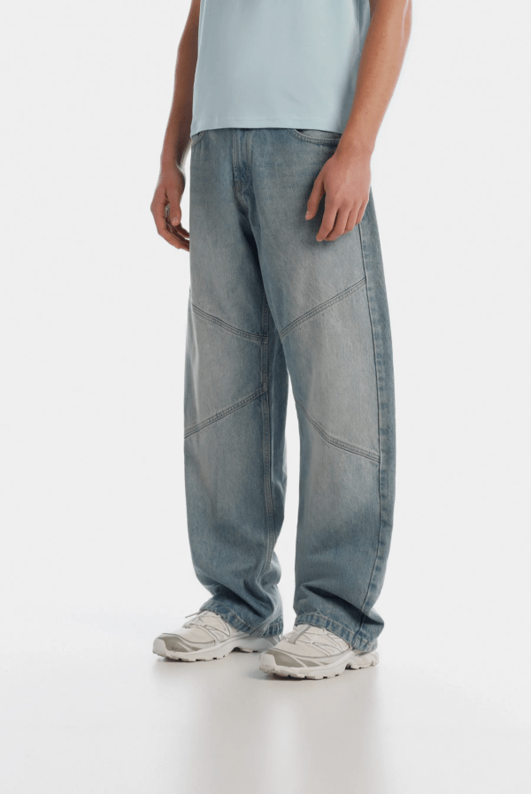 Jean fit baggy azul medio, confeccionado en tela 100% algodón premium, de 12 oz. Diseñado con cinco bolsillos, cortes diagonales a la altura de rodilla, con dirty vainilla, iluminaciones sandblast en delantero y posterior. Lleva insumos y garras contramarcados.